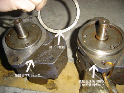 客戶服務中心在舊件驗收時也應注意檢查變速泵上是否帶有這個墊圈,如有應及時拆下寄回服務單位,通知補裝回去。
